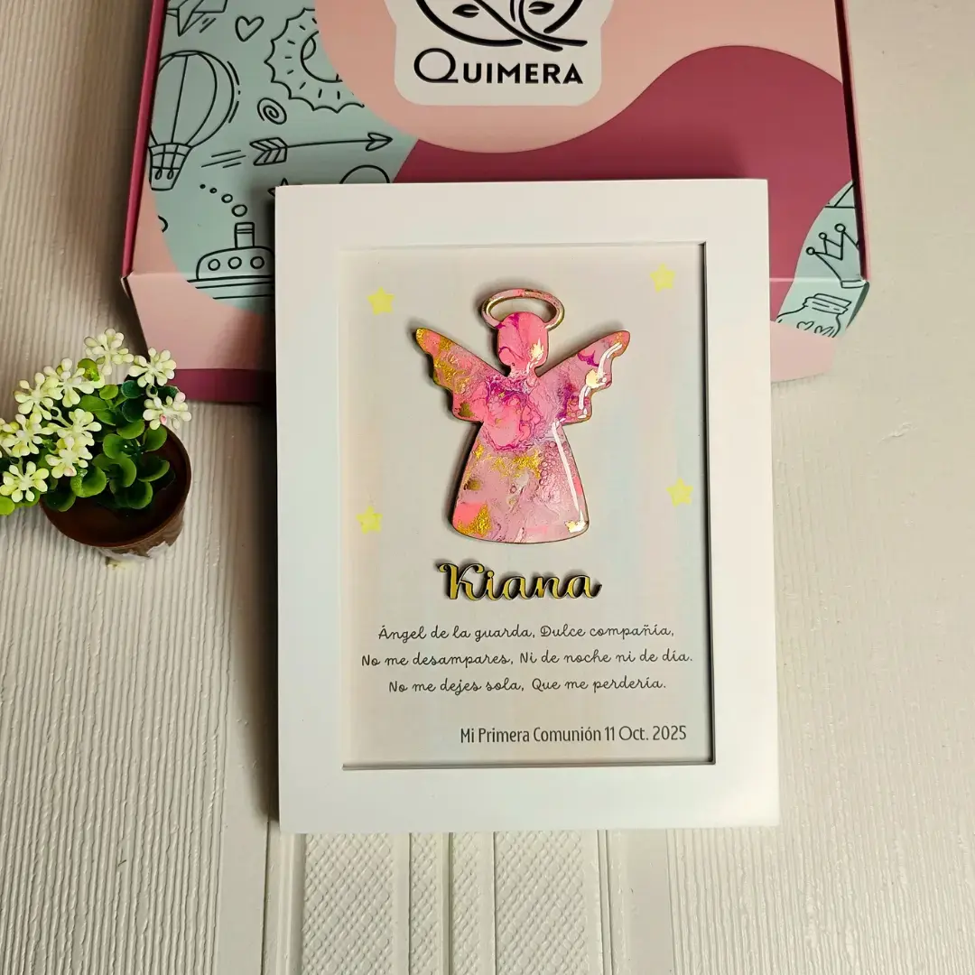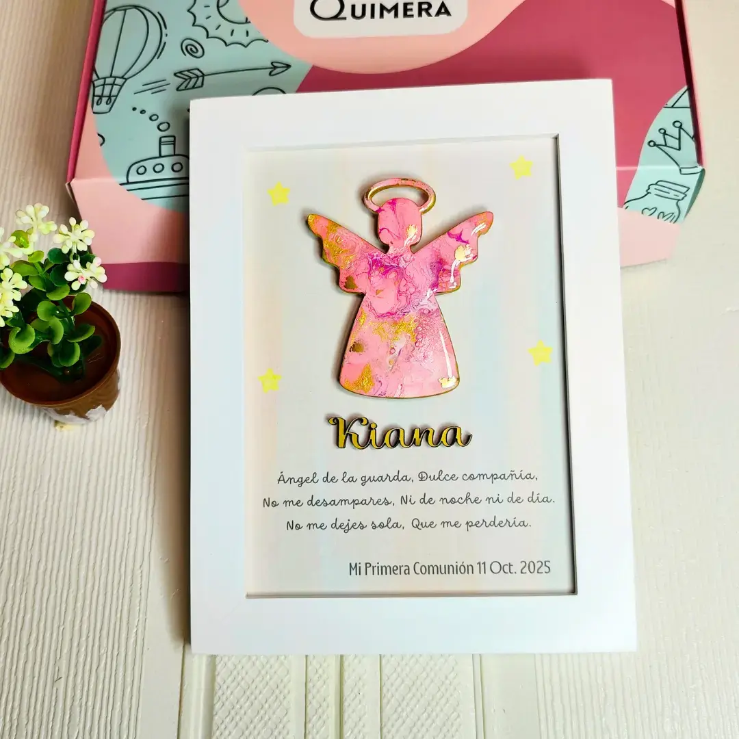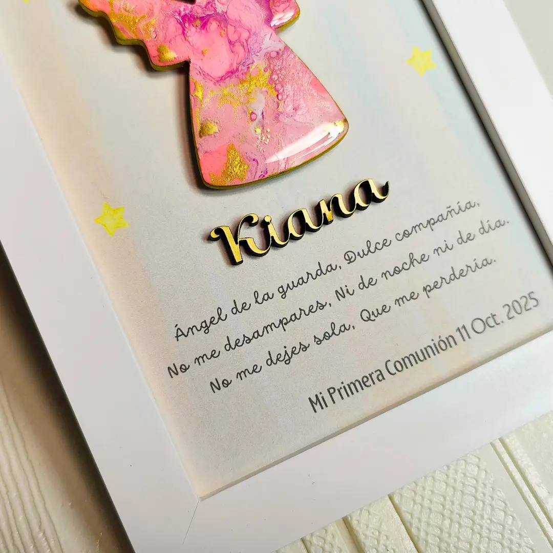 Regalo de Primera Comunión 2025 . Cuadro de ángel pintado a mano en arte fluido y acabado en resina. Incluye la oración del Ángel de la Guarda, el nombre en madera y la fecha personalizada. Tamaño: 16 x 21 cm. Listo para regalar.