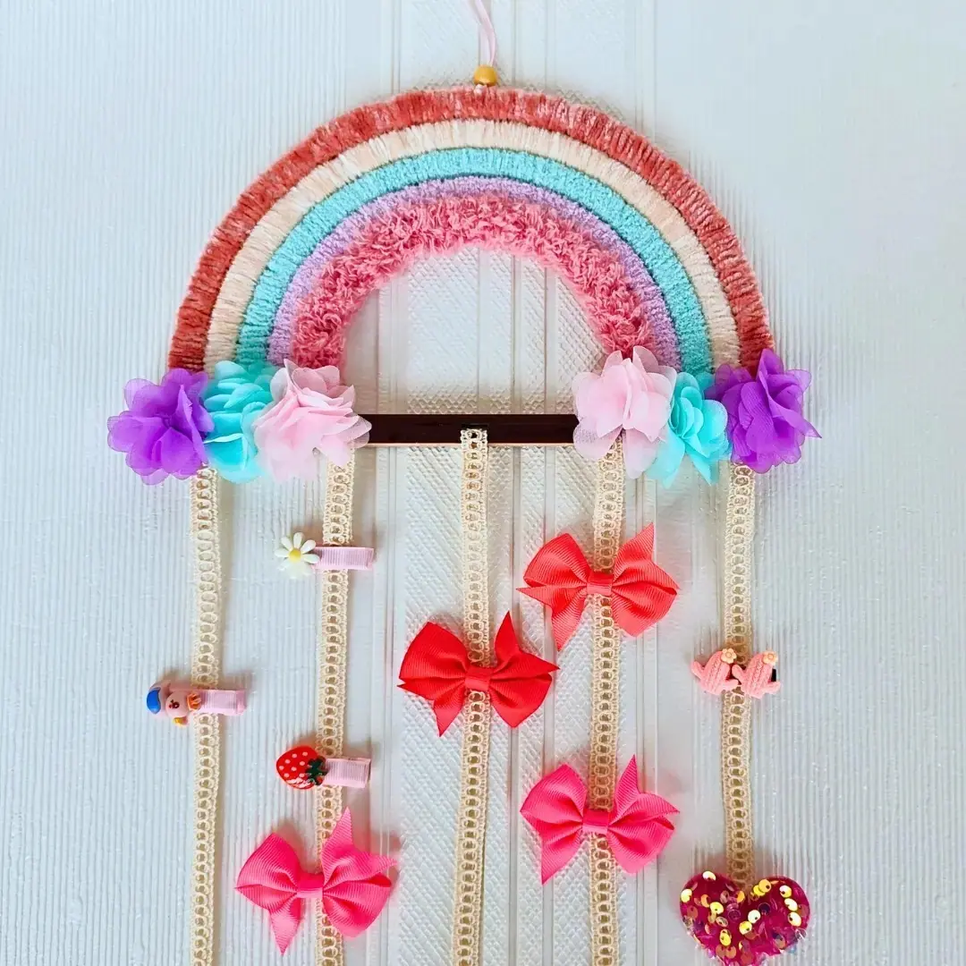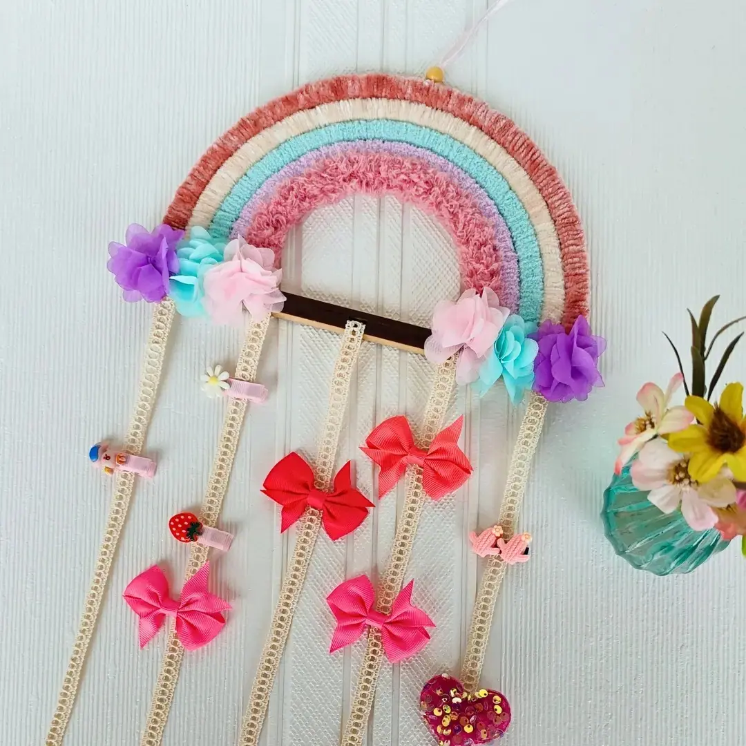 • Diseño encantador: Este arcoiris no solo es decorativo, sino también práctico, ya que cuenta con cintas donde puedes colgar fácilmente ganchos o pinzas de pelo.