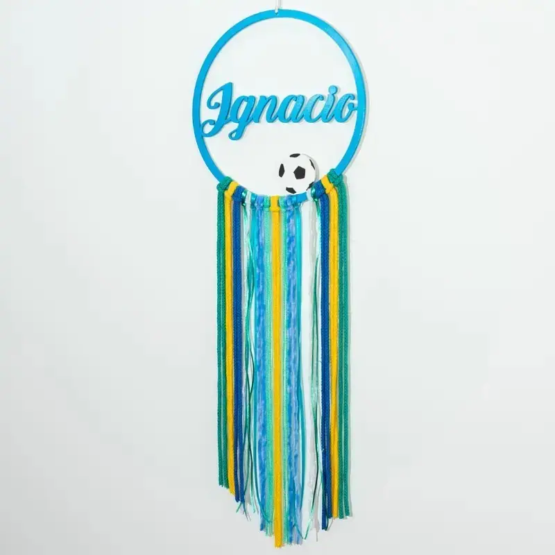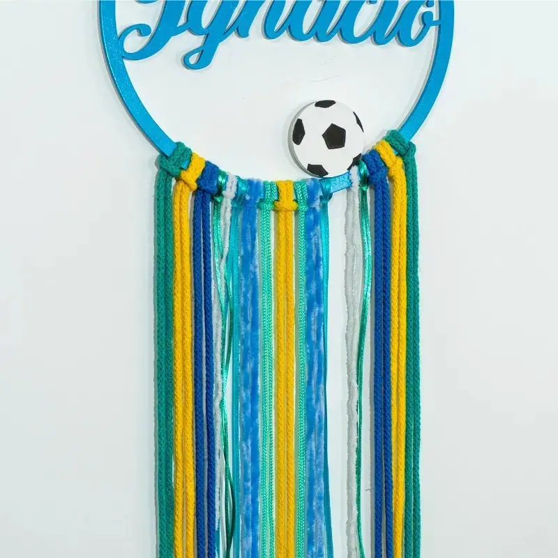 • Diseño decorativo con aro de madera pintado en azul, cintas de tela y lana en tonos verdes, azules y amarillos, acompañado de un balón de fútbol en el centro que le da un toque temático y divertido.